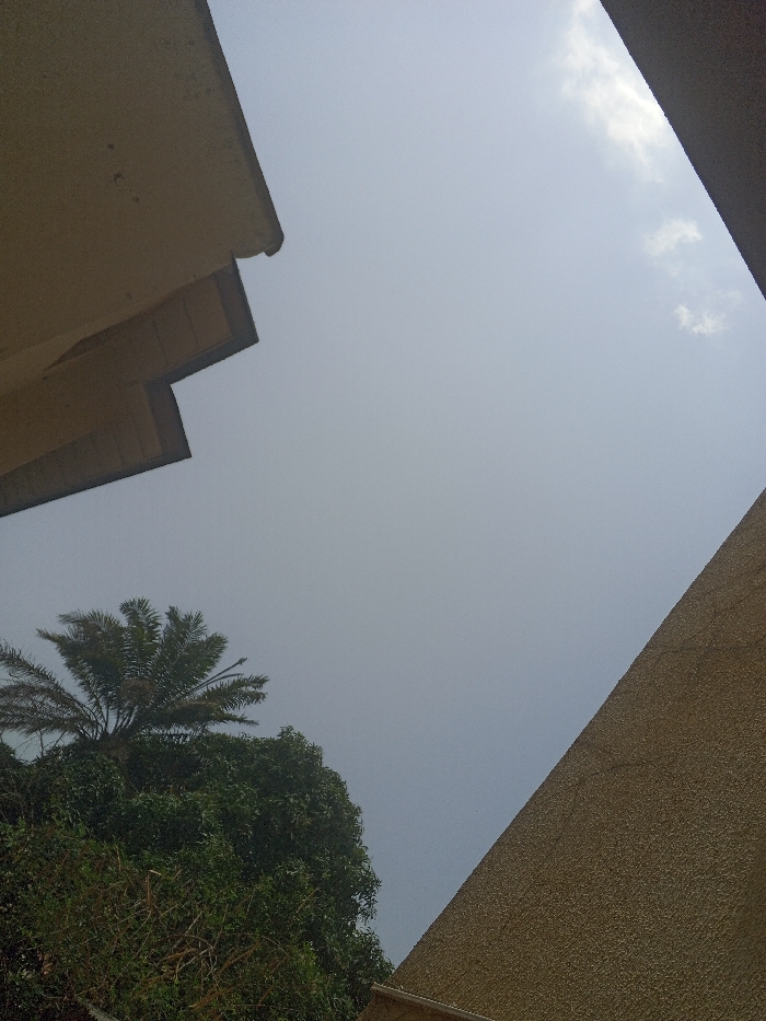 The scene, located in Oko Erin, Nigeria, depicts an upward view of a pale blue-grey sky with sparse white clouds in the upper right quadrant