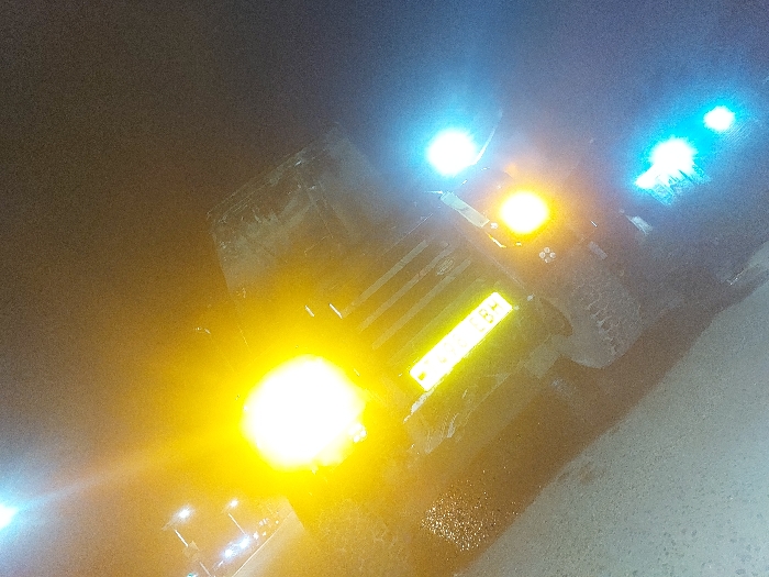 The scene is captured at night in Msata, Tanzania. A large vehicle, likely a truck, is positioned diagonally across the frame, its form largely obscured by intense light sources. The vehicle displays a dominant, bright yellow-white light in the upper left-center. A rectangular yellow reflective object, possibly a license plate, is visible below this light, showing partial characters "TBH." To the right, two distinct yellow circular lights and two distinct blue-cyan circular lights are illuminated. The ground surface in the foreground appears dark and reflective, suggesting wetness or a polished surface. No individuals are visible, and no specific actions or interactions are discernible.