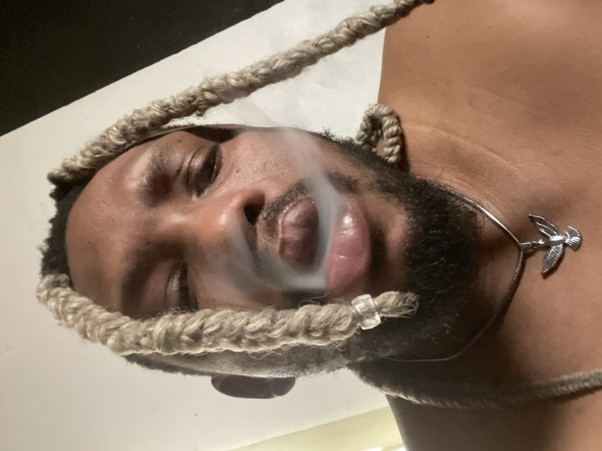 A close-up, low-angle image depicts an adult individual with dark skin, facing forward with eyes closed or partially closed. The person has light-colored dreadlocks or braids, several strands extending downwards, with one visible strand adorned with a clear, cylindrical bead. A dark beard covers the chin and jawline. White vapor or smoke is being exhaled from puckered lips. A silver-colored chain with a dove-shaped pendant rests on the individual's bare chest. The background consists of a light-colored wall or surface on the left and a darker, indistinct area on the right. The scene is located in Jos, Nigeria.