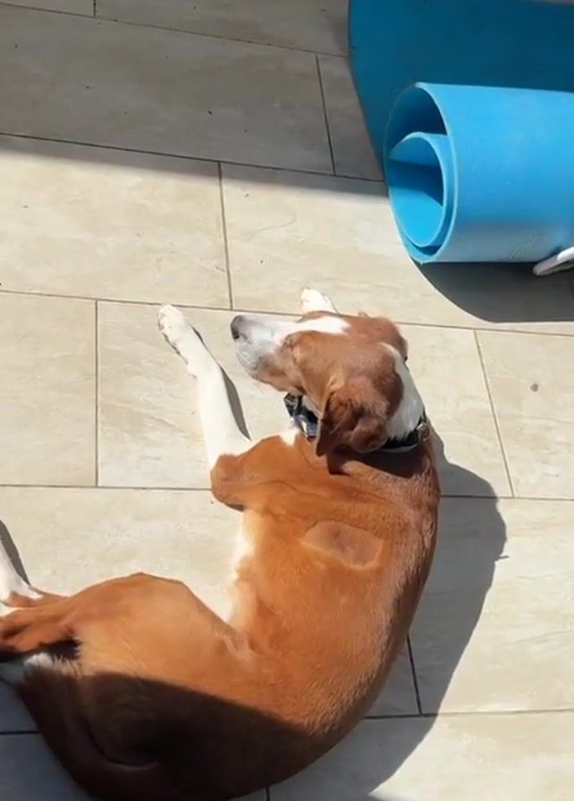 medium-sized dog lying on a tiled patio. The dog has brown fur with white markings on its face, chest, and paws. It is wearing a blue collar with a patterned design. The dog is lying on its side in the sun. A rolled-up blue yoga mat and a blue bucket are visible in the background.