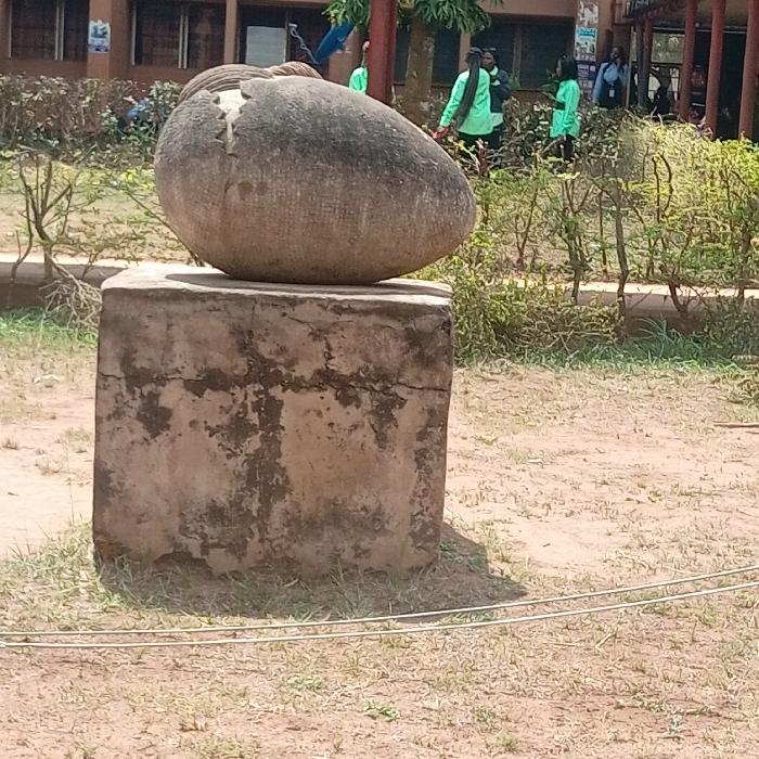 The image displays an outdoor scene, likely situated on the campus of the University of Nigeria, Nsukka, within the city of Nsukka, Nigeria. The central subject is a large, grey, weathered ovoid stone sculpture, featuring a prominent crack or fissure on its upper surface, resting on a cuboid concrete plinth. The plinth is discolored with dark stains and appears aged. The immediate foreground consists of reddish-brown dirt sparsely covered with patches of green grass, traversed horizontally by two taut, thin, light-colored wires. In the background, behind a line of green shrubs and some bare branches, stands a multi-story building characterized by brown walls and multiple rectangular windows. Several individuals are visible near this building; some are observed wearing light-green long-sleeved shirts or vests, and one person is distinguished by long, braided hair. Their specific actions or interactions are not clearly discernible beyond their presence in the scene.