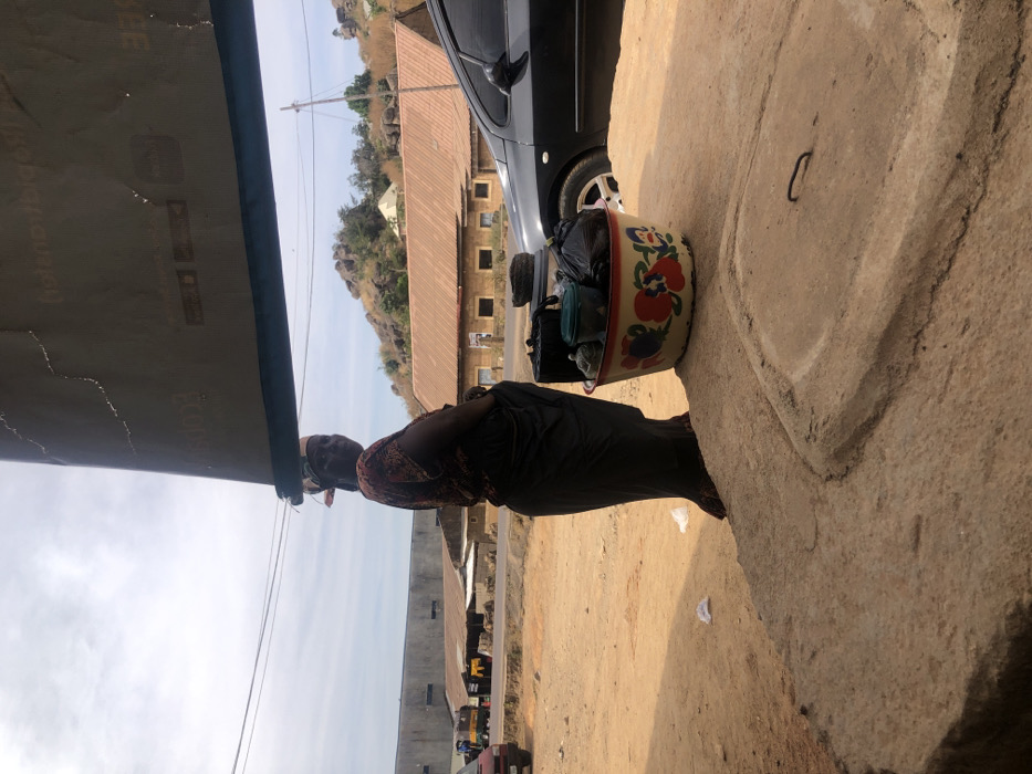 An outdoor scene on Rukuba Road, Nigeria, depicts an adult female standing next to a concrete structure under an overhead awning