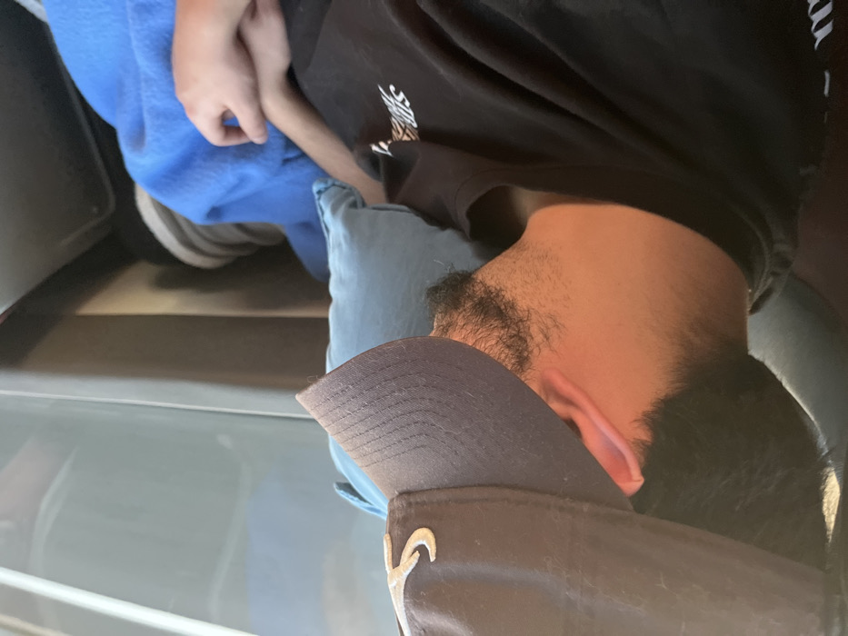 The image depicts two individuals inside a vehicle, located in the city of Leiria, Portugal. The perspective is an overhead view, with the subjects positioned horizontally across the frame. In the foreground and occupying the lower-left portion of the image, a person is observed resting their head on a light blue fabric cushion. This individual wears a dark baseball cap with a light-colored emblem on the front, resembling a crescent or the number '5'. They are dressed in a black t-shirt with a white graphic logo visible on the right chest area. Dark facial hair is present on their jawline and neck. Their visible skin exhibits a reddish-brown tone, potentially from ambient light. In the upper-right section of the image, the left arm and partially clasped hand of a second individual are visible. This hand rests upon a bright blue blanket. The background consists of a light grey panel, possibly an interior wall or window frame, and darker upholstered surfaces, consistent with the interior of a vehicle.