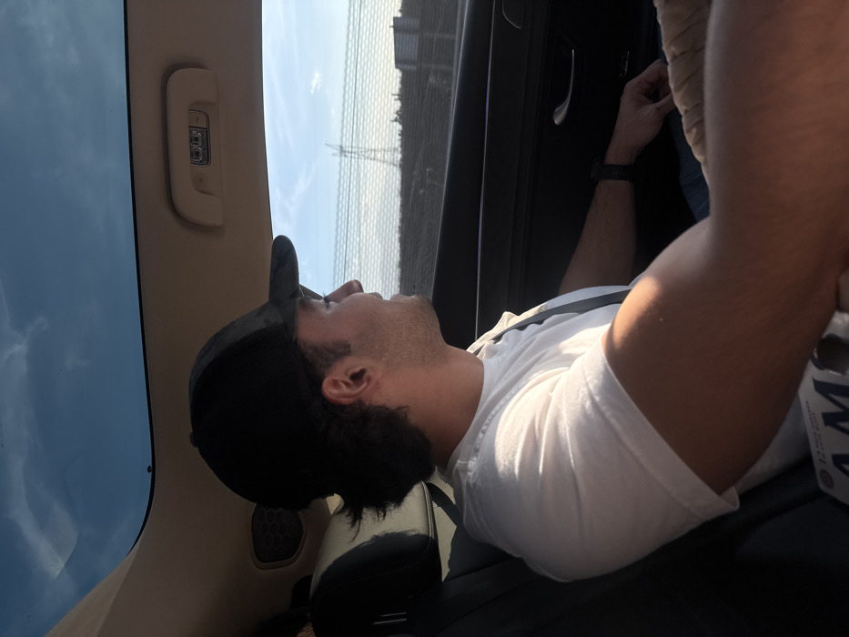 A man in a car is looking up through a sunroof. He wears a black baseball cap and a white T-shirt. His right arm is raised, and a watch is visible on his left wrist. The car interior is light colored near the roof and dark around the door. Outside the window, an electrical tower is seen against a bright sky. The image appears to be rotated to the side.