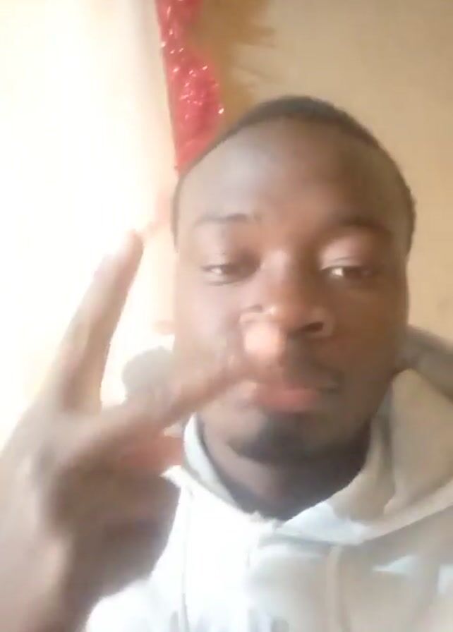 A close-up video shows a young man with dark skin wearing a white hooded sweatshirt