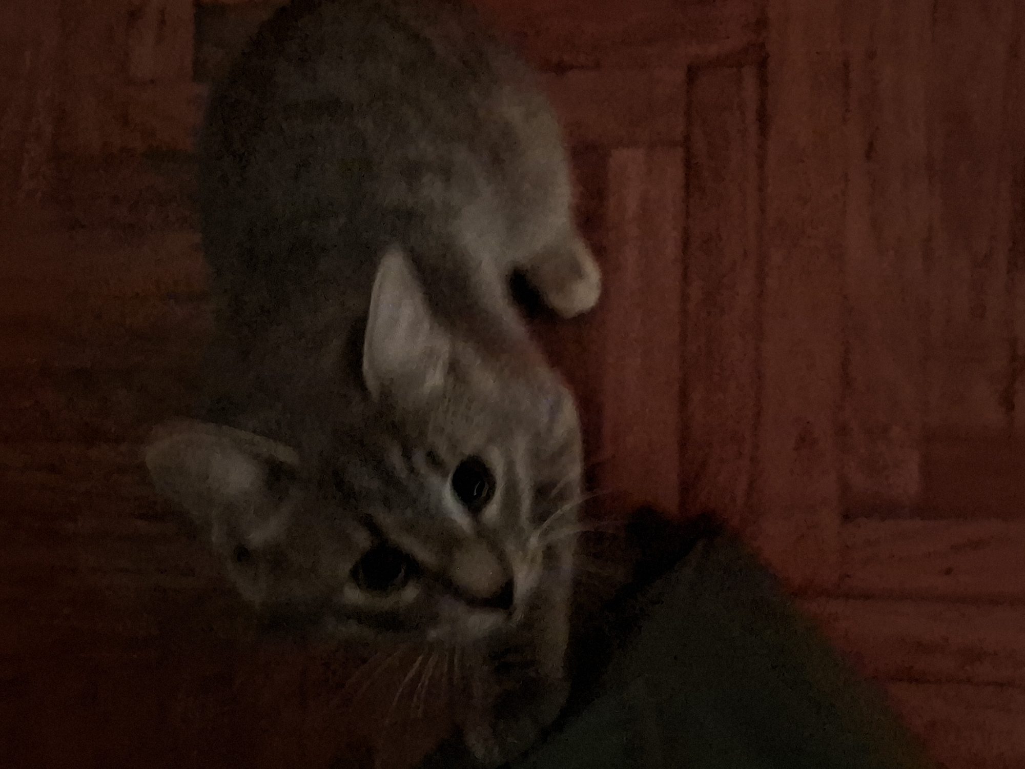 - "A grey tabby kitten is looking up at the camera" by FM-cs6EQ2, licensed under CC BY 4.0