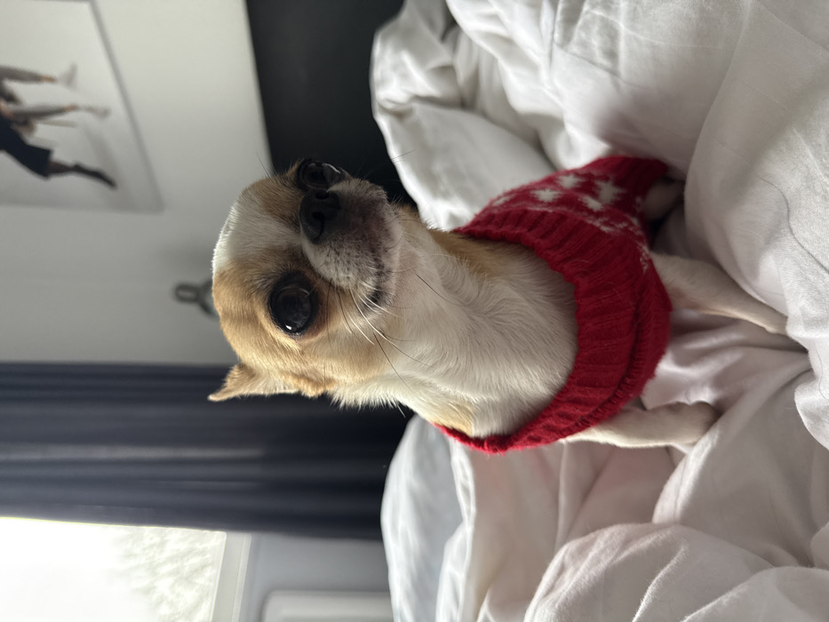 - "A bi-color chihuahua, exhibiting tan and white fur, is centrally positioned on white, rumpled bedding in what appears to be a bedroom in Berlin, Germany" by FM-eQUGe2, licensed under CC BY 4.0