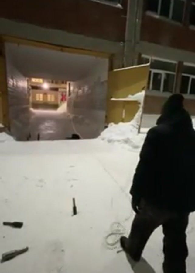 A person in a black jacket and dark pants is seen standing in a snowy area, facing away from the camera, holding a rope that leads toward a tunnel-like passageway. Several glass bottles are lying on the snow near the person. The passageway is illuminated, and the structure around it appears to be a brick building with several windows. The scene suggests an outdoor environment in winter.