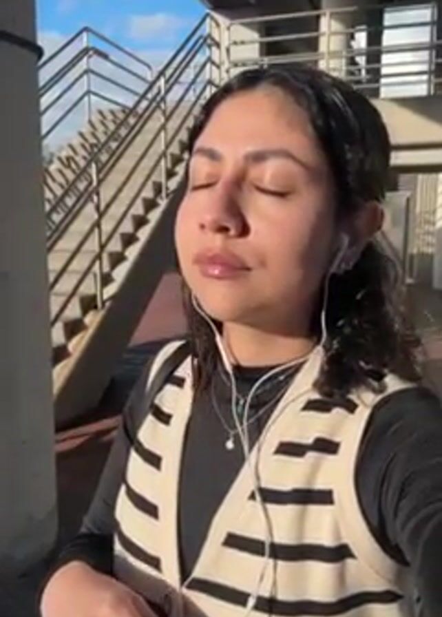 A young woman is standing outside in the sun, under a structure with metal stairs. She has curly dark hair and is wearing a black long-sleeve shirt and a white vest with black stripes. She has earbuds in and appears to be listening to something. She has her eyes closed and is facing the sun. There is a bag on her shoulder, and she is wearing jewelry. A voice announces that the King/Kennedy station is out of service.