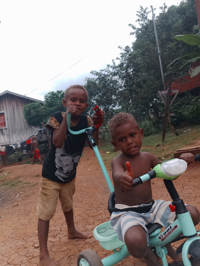 Two young boys pose outdoors with a light blue tricycle on cracked dirt. One boy wears a black shirt with a skull design and khaki shorts, standing beside the tricycle's handle, and holding a red toy. The other boy sits on the tricycle, shirtless with striped shorts, and both give thumbs up. In the background, a house with laundry hanging and a lush green area with trees, and a utility pole are visible. The sky appears overcast.