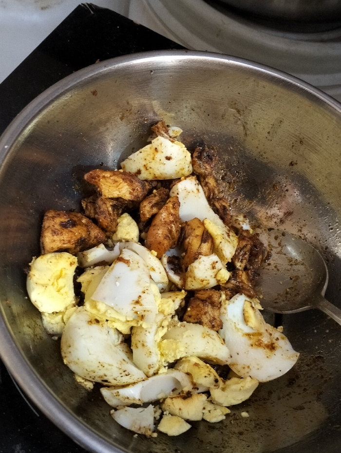 The image displays a metallic bowl, likely stainless steel, filled with a mixture of cooked ingredients. The primary components are irregularly cut pieces of browned chicken and roughly chopped hard-boiled eggs, showing distinct white and yellow sections. Both chicken and egg pieces are speckled with dark seasoning, suggesting spices. A metallic spoon or ladle is partially visible, resting within the food mixture on the right side of the bowl. The bowl is situated on a dark, reflective surface, possibly a stovetop or countertop. In the upper right background, a blurred, curved metallic object is partially visible. No people are present. The specific location within Hims, Syria, cannot be determined from the visual information provided. The scene depicts a domestic kitchen environment.