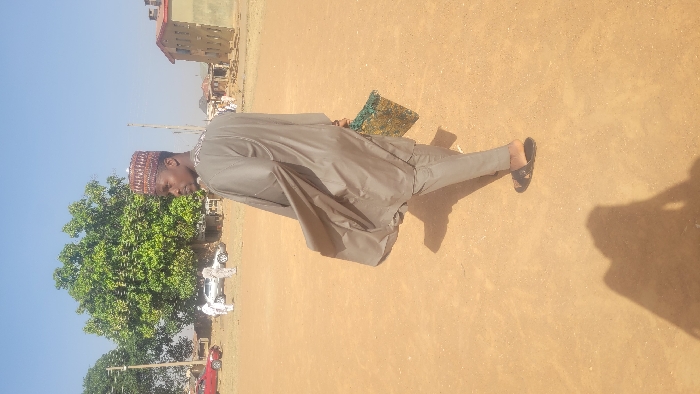 An outdoor scene in the city of Badiko, Nigeria, shows a man in the foreground walking across a barren, reddish-brown dirt ground