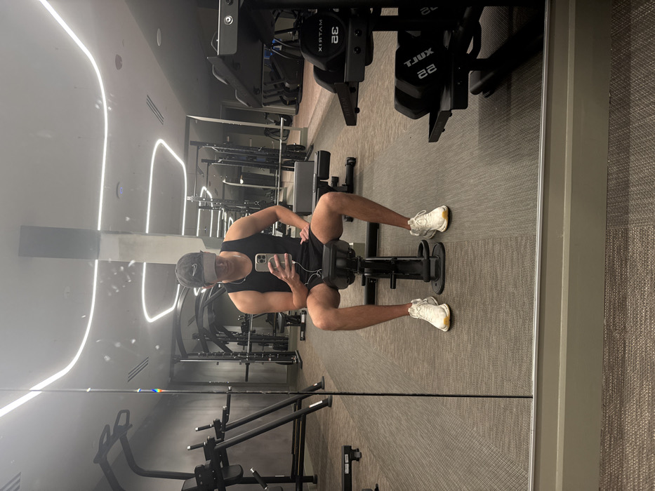 A man in athletic attire sits on a gym weight machine, facing a mirror. He's wearing a tank top, shorts, sneakers, and a baseball cap, holding a phone in his hand. The gym setting features various weight machines and equipment, with neutral-toned walls and flooring. Reflective lights illuminate the ceiling, and the image appears to be a self-portrait taken in the gym.