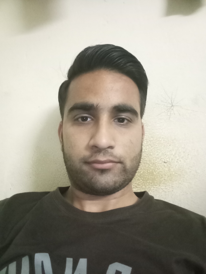 The image presents a head-and-shoulders portrait of an adult male, centered and looking directly forward with a neutral expression. He has short, dark, styled hair, dark eyes, and stubble on his chin and jawline. The subject is wearing a dark-colored crew-neck t-shirt with partial light-colored lettering visible on the chest. The background is a plain, light-colored wall featuring a distinct spiderweb-like crack pattern on the upper right side and a discolored patch below it. The location of this scene is the city of Chah Sultan, Pakistan.