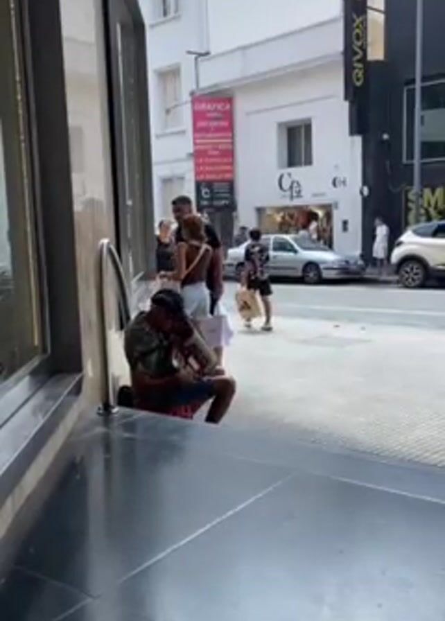 A man sits on the ground playing an accordion next to the entrance of a building. He wears a cap, a camouflage shirt, and shorts. Pedestrians walk by on the sidewalk. Several buildings are visible across the street with shops and signs, including a sign that says "GRAFICA." A white car and a black SUV are parked on the street. It is daytime.