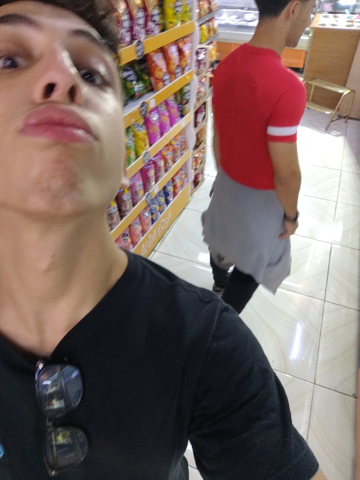 An indoor scene within a retail establishment, likely a convenience store or supermarket, located in Joubar Municipality, Syria. The primary subject, positioned in the lower-left foreground, is partially visible, featuring a light-skinned individual with minimal facial hair, wearing a black V-neck t-shirt with sunglasses tucked into the neckline. This individual is looking slightly upwards and to the right, with lips pursed, indicating a possible selfie or self-recording. In the background, to the right, another individual is seen from behind, walking away from the camera. This person wears a red short-sleeved t-shirt with a white horizontal stripe on the right sleeve, dark pants, and has a light grey long-sleeved garment tied around their waist. The environment features yellow and orange metal shelving units on the left, densely stocked with various packaged snack foods in colorful bags. The floor is covered with large white square tiles, and artificial overhead lighting illuminates the area. Further in the background, a display case and a light wooden shelving unit are partially visible.