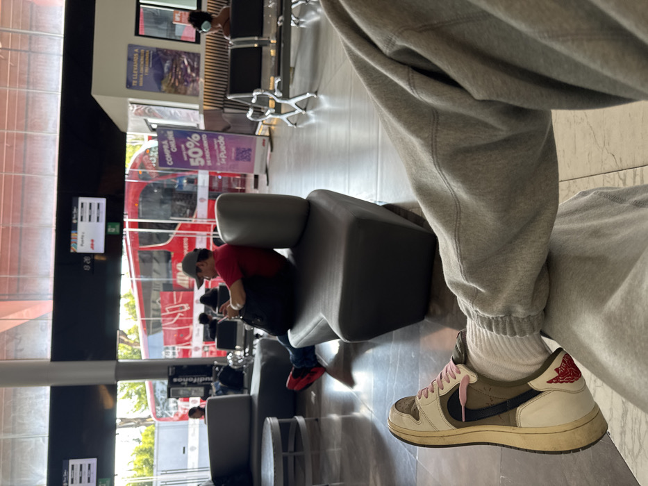 The picture shows the lower half of a person wearing grey sweatpants and a pair of low-top sneakers in what appears to be an airport waiting area. The shoes are a mix of earth tones with a dark swoosh and pink laces. In the background, people are sitting on grey chairs near a window looking out to a red bus. There are digital signs on the wall, as well as posters, indicating this might be a bus station rather than an airport.