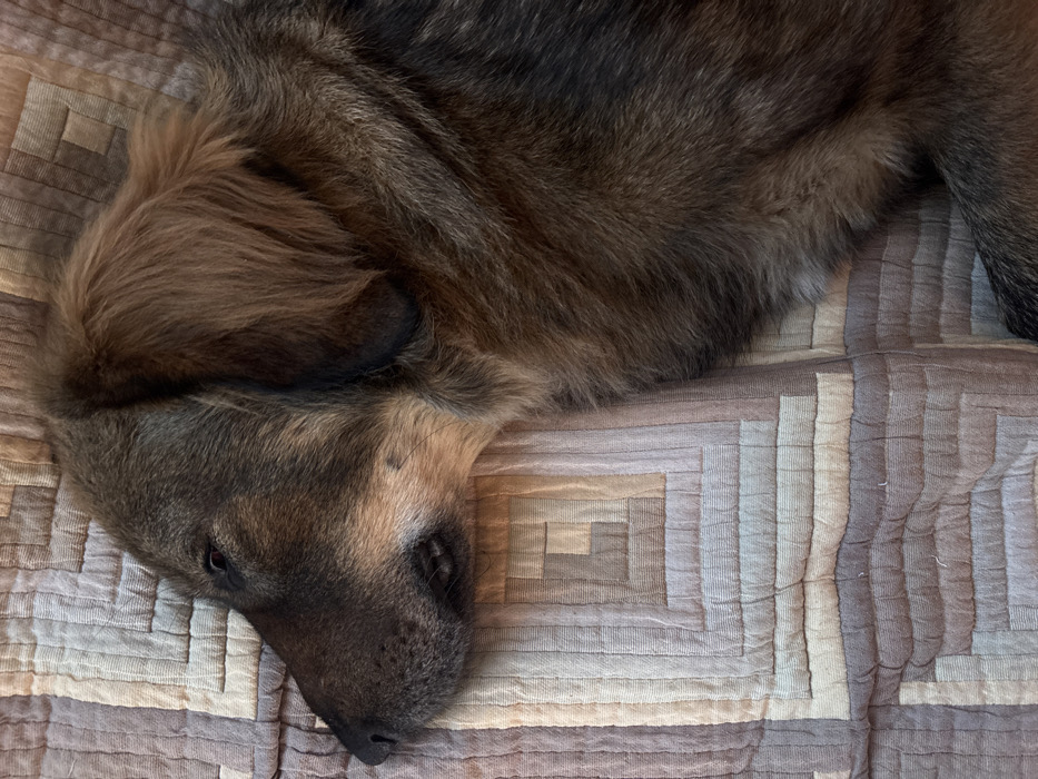 - "A medium to large-sized dog lies resting on its left side, positioned on a patterned quilt in Kunje, Montenegro" by FM-CAOHw1, licensed under CC BY 4.0