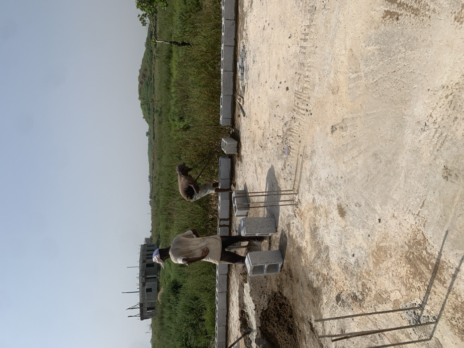 The image displays an active outdoor construction site in Karsana 2, Nigeria, under a clear blue sky