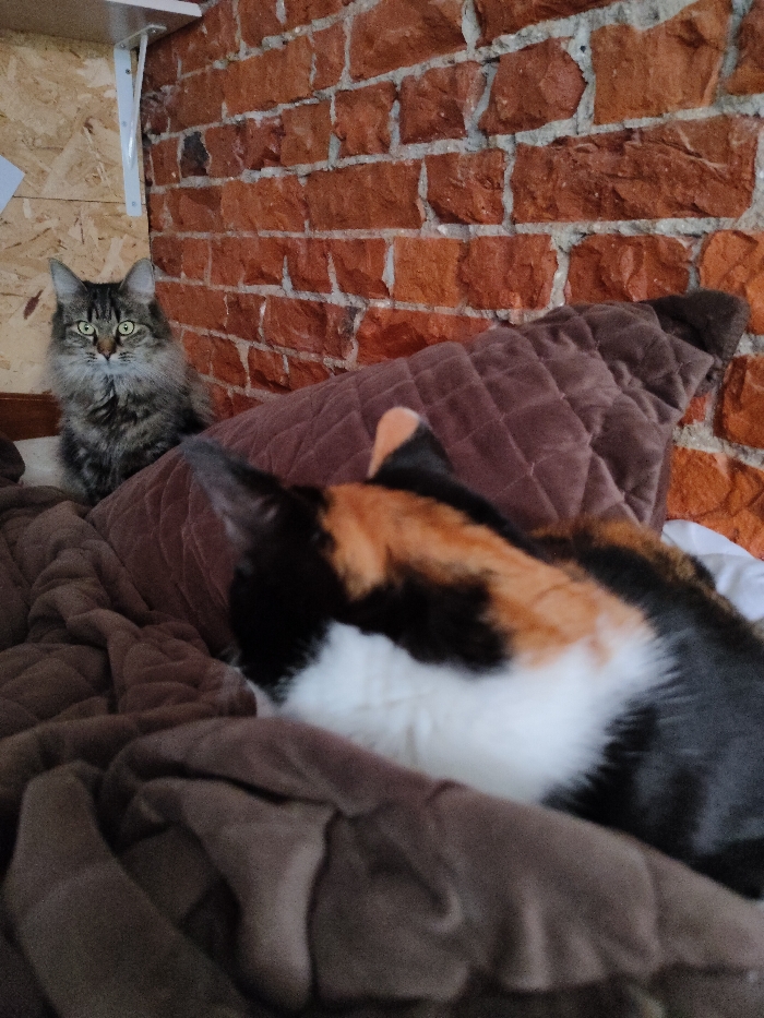 The scene depicts an indoor, residential-style room in Saint Petersburg, Russia. The precise location within the city is not discernible from the visual evidence. In the foreground, slightly out of focus, is the back and head of a calico cat, primarily black, white, and orange/brown in coloration. This cat is situated on or under soft, dark brown quilted bedding, facing away from the camera and towards the right. In the midground, to the left, a long-haired tabby cat with striped grey, brown, and black fur and distinct green eyes is in sharp focus. It sits upright, looking directly at the camera. This cat is also resting on dark brown bedding, possibly a blanket or comforter, which appears plush and quilted. The background features a wall composed of exposed, rough-hewn red bricks with light gray mortar joints. To the far left, a light-colored wooden panel or chipboard surface is visible, against which a white, angled shelf bracket is attached. No people are present.