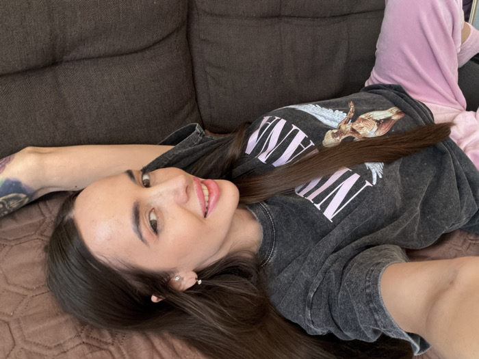 In Novosaratovka, Russia, a female individual is depicted lying on her back on a brown, textured blanket covering a dark brown, tufted sofa. She is oriented with her head slightly tilted and supported by her left arm, looking towards the camera with a smiling expression. Her long, dark hair is spread out, with a significant portion resting across her chest. She is wearing a dark grey t-shirt featuring a "NIRVANA" graphic and an angelic illustration. Partially visible pink casual trousers are present on her lower body. A multi-colored tattoo is visible on her left forearm/upper arm. Her left ear features a silver stud earring and an additional silver piercing on the cartilage.