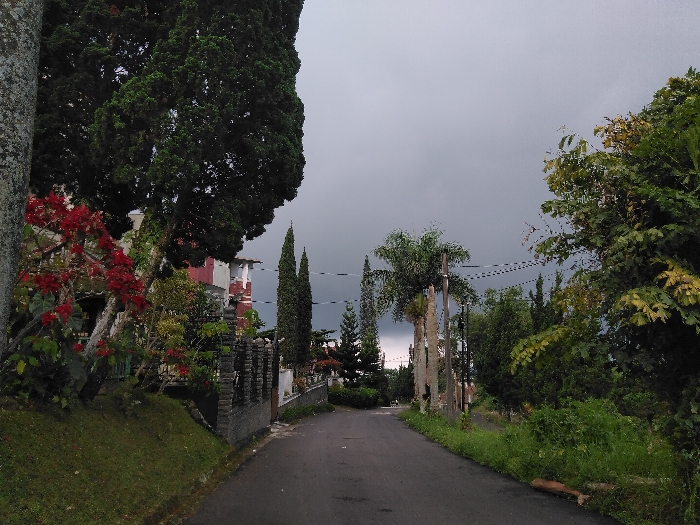 An asphalt road recedes into the distance under a heavy, dark gray overcast sky, suggesting impending rain or low light conditions