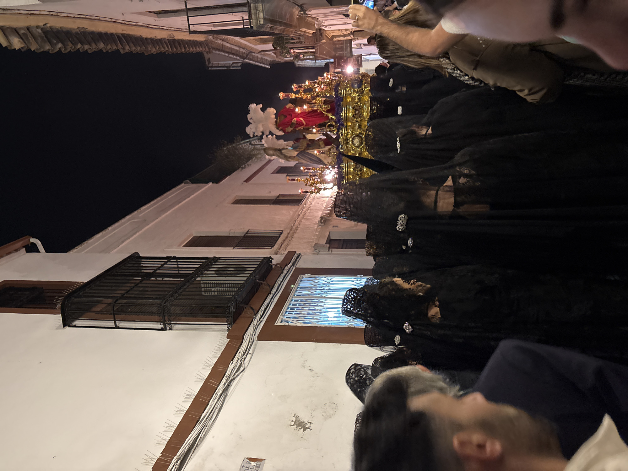 The image captures a religious procession in Córdoba, Spain at night. A golden float with figures, possibly depicting Jesus or Mary, is carried through the narrow street lined with white buildings. Women in black veils follow the float. The street appears crowded. A person is taking photos with a cell phone.