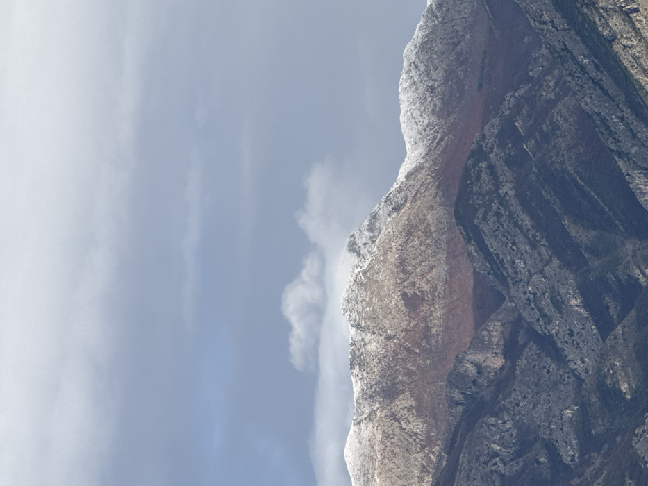The image displays a mountainous landscape located in Polje, Montenegro, under a partially overcast sky. The upper third of the frame shows a sky gradient from light blue to grey, with scattered, lighter cumulus clouds present horizontally across the mid-sky. The lower two-thirds are dominated by multiple mountain ranges. The lowest visible mountains are characterized by dark grey, rugged, and shadowed rock formations. Above these, a horizontal band of reddish-brown vegetation or soil is present, indicating a transition in terrain. The highest peaks of the mountains are snow-capped, with patches of white snow contrasting against lighter, rocky surfaces underneath. No individuals, animals, or artificial structures are visible in the scene.