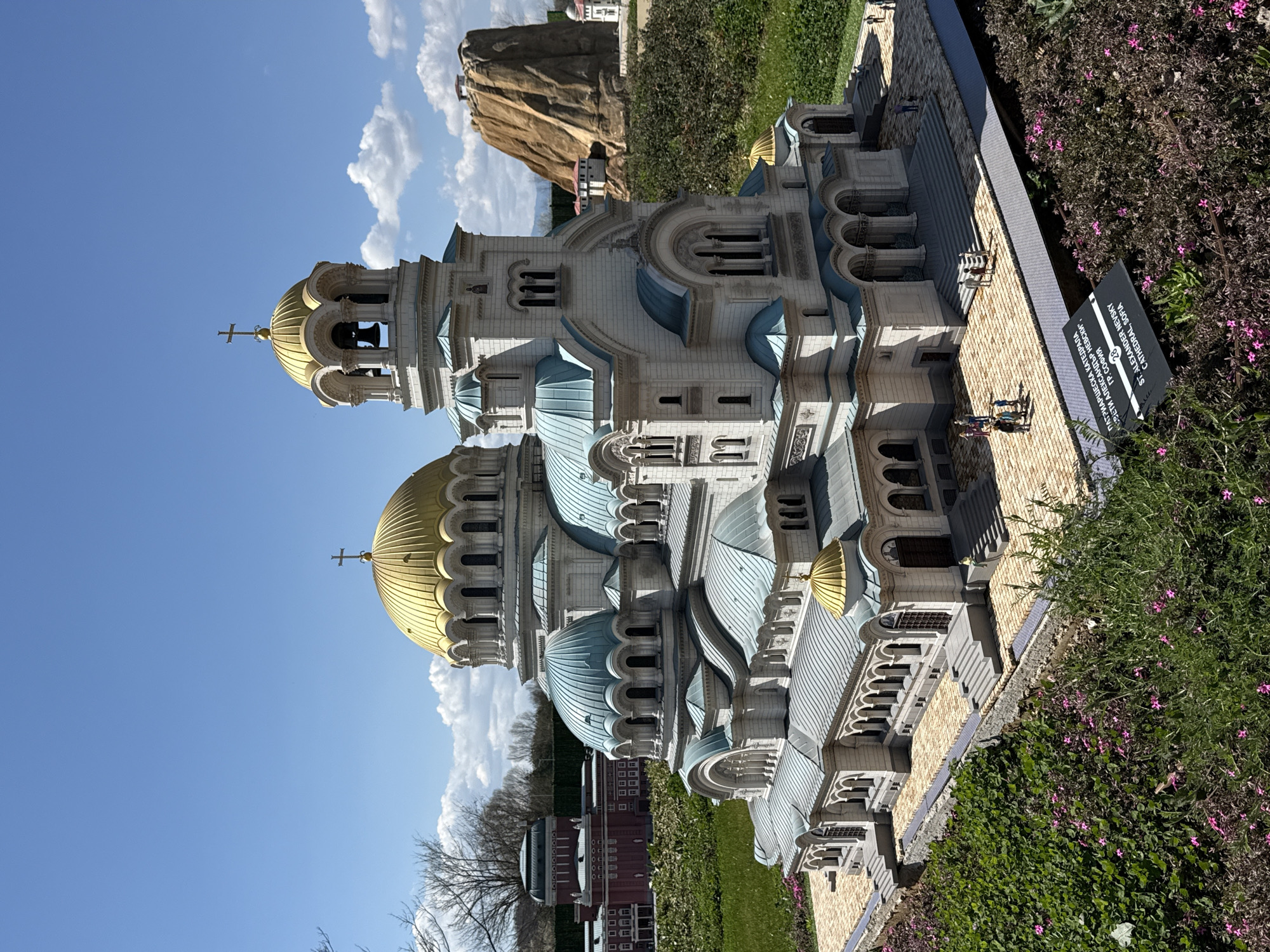 The image depicts a miniature recreation of the St. Alexander Nevsky Cathedral in Sofia, Bulgaria, as indicated by a nearby sign. The cathedral model features golden domes, white stone facades, and blue-green roofs, closely mimicking the original architectural style. The model is set within a park-like environment, with green foliage and flowers visible around it. In the background, other miniature structures and possibly a small artificial mountain can be seen, suggesting that this is a miniature park showcasing landmarks. There are miniature people visible. The image is taken from a slightly elevated position.