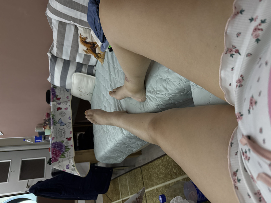 The image depicts a first-person, downward-facing perspective of a person's bare legs and lower torso within an indoor setting