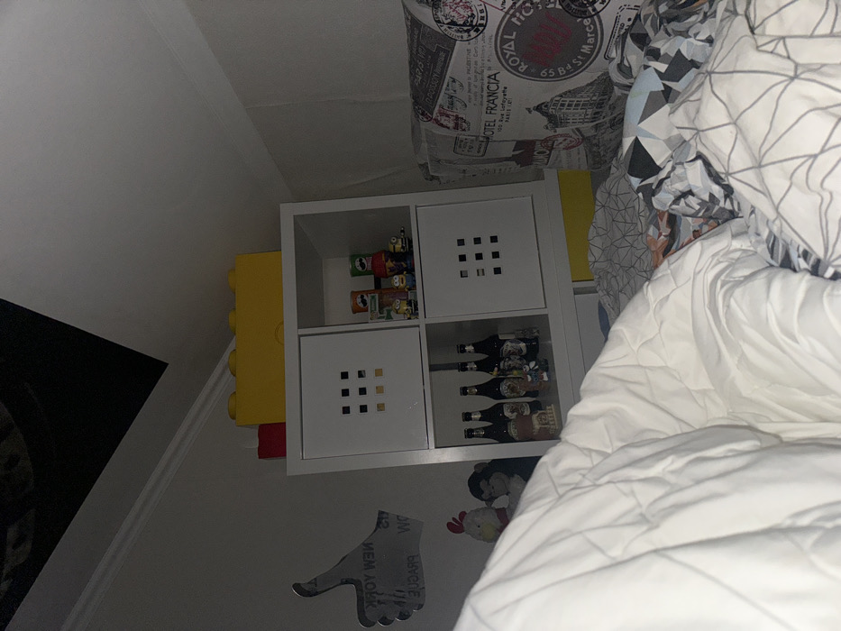 A white, four-section shelf contains items in each square. The top left square has stacked Pringles containers with Minions characters. The top right and bottom left squares have white doors with a grid of square cutouts. The bottom right square holds three rows of dark-colored bottles with labels. A yellow brick-shaped object is to the left of the shelf. Below, a pointing-hand sticker and a chicken illustration are visible. Bedding with a white quilted comforter and patterned pillows are positioned to the right of the shelf.