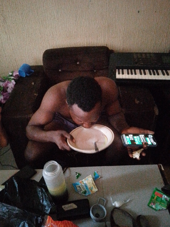 A shirtless man sits on a dark brown sofa, eating from a white plate while holding a smartphone in his left hand. The phone screen displays a green interface, possibly a game or app. Beside the sofa is an electronic keyboard. A table in front of the man holds a black trash bag, a translucent bottle with a yellowish liquid, packets of seasoning, a cassette player, a metal mug, and other assorted items. The overall scene is cluttered and somewhat messy.