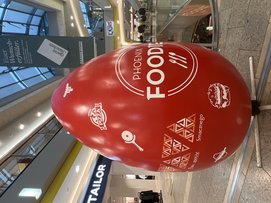 The image displays the interior of the Phoenix Center shopping mall, located in Hamburg, Germany. A large, approximately 3-meter tall, red, egg-shaped inflatable object occupies the foreground, positioned on a light grey tiled floor. This object is adorned with white graphics, prominently featuring "PHOENIX FOODIE" with a fork and knife icon, enclosed within a semi-circular border. Additional white food-related icons include a pizza slice, a pizza cutter, a chef's hat, a rolling pin with dough, and a burger. The phrases "Bon apetite" and "Smacznego" are also visible. The inflatable is supported by a white, open-frame metal base. The background shows a multi-level indoor environment with glass railings, beige structural columns, and a glass skylight ceiling. To the left, a store with a large illuminated sign reading "TAILOR" is identifiable. A tall green banner hangs from the ceiling in the mid-ground, displaying the text "Euer Wunscherfüller," "CENTER Gutschein" with a gift card icon, and "PHOENIXCENTER." Escalators leading to lower levels are visible on the right, with their glass balustrades reflecting parts of the red display. Several indistinct human figures are present on the upper levels of the mall, suggesting general pedestrian activity. Recessed lighting fixtures are visible on the ceiling and structural elements.