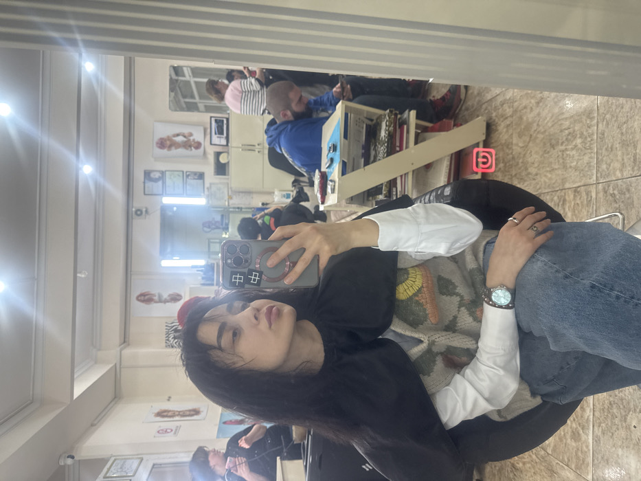 A person sits in a salon chair, taking a selfie in a mirror