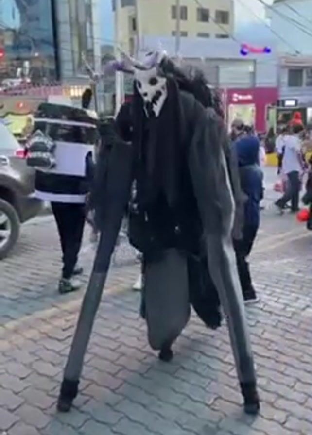 A video captures a crowded Halloween street scene in what seems to be a commercial area. The pavement is made of interlocking pavers. In the center of the frame, a person is dressed in an elaborate Grim Reaper-esque costume featuring a horned skull mask, black tattered fabric, and large stilt-like appendages for legs. This figure walks slowly amidst the crowd of onlookers. A person in a coffee-cup costume can be seen in the background to the left. The street is lined with buildings, some of which have storefronts visible. Many people can be seen walking about, some with children. The lighting is soft, suggesting it is dusk or early evening.