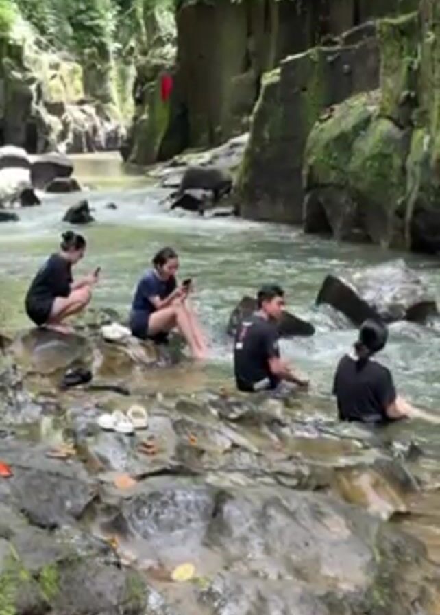 river with four people sitting on large rocks. Two women are sitting on the rocks, looking at their cell phones. A man is sitting further into the river, holding the rocks with his hands. Another woman sits further into the river with her back turned to the camera. There are shoes sitting next to the rocks. The river flows through a dense forest.