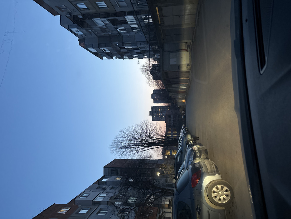 The image depicts an urban environment in Gabrovo, Bulgaria, captured during a transitional period of dim natural light, indicative of dusk or dawn. The perspective is from inside a vehicle, with the upper dashboard and windshield base visible in the foreground. A paved access road or parking area extends into the background. On the left, a multi-story residential apartment block, predominantly grey with sections of red brick, runs parallel to a line of at least six parked passenger vehicles. The nearest vehicle is a dark grey hatchback. A bare deciduous tree and an active streetlamp are positioned between the building and the parked cars. On the right, another multi-story residential apartment block is partially visible behind a continuous row of single-story garage structures featuring metal doors, which also line the road. Light from a vehicle's headlights illuminates portions of the pavement in the foreground and mid-ground. In the distant background, two taller residential apartment blocks with multiple illuminated windows are silhouetted against the horizon, where the sky transitions from a dark blue overhead to a faint pinkish-orange hue. Additional bare trees are discernible in the background. A single, small human figure is visible walking on the paved surface in the distant middle ground. Artificial lighting is active from the streetlamp and various building windows.