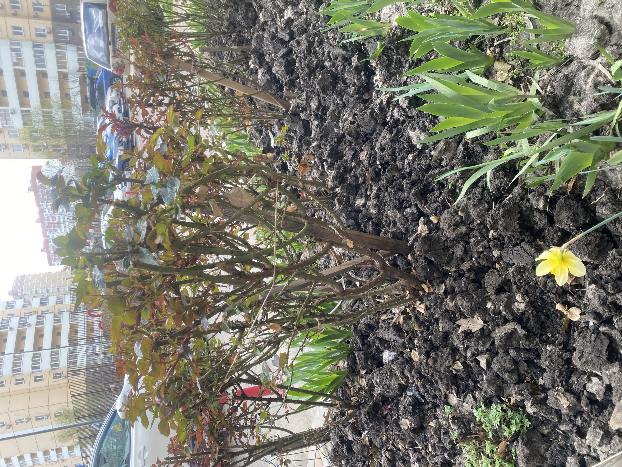 The image depicts an urban garden bed within a residential area of Krasnodar, Russia. The foreground features dark, clumpy soil with various plants. Multiple rose bushes, recently pruned with emerging reddish-green leaves, occupy the central and left portions of the bed, some supported by wooden stakes. Clumps of young green shoots, possibly irises, are visible on the right and center. A single yellow daffodil blooms in the lower-left. Scattered dry leaves and minor plastic debris are present on the soil. In the midground, a dark metal fence separates the garden from an asphalt parking area. Several vehicles are parked, including a white sedan on the left, a dark blue sedan, a silver sedan, and a beige/gold hatchback on the right, which displays part of a Russian license plate "777" followed by "93", confirming Krasnodar Krai. A blue car with a roof cargo box is also visible. No individuals are present. The background is dominated by multi-story residential apartment buildings. A prominent yellow building with numerous windows and balconies stands on the left. A reddish building is visible further back on the right. Sparse trees with budding leaves are situated between the fence and the buildings. The sky is overcast.