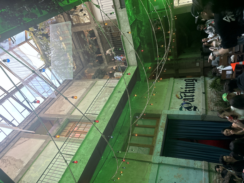 An indoor open-air venue shows a building with exposed concrete and metal framing, suggesting an industrial aesthetic. String lights with colored bulbs hang across the space, adding a festive touch. People are present, some seated and others standing, indicating a social gathering. The "Parking" sign on a green wall hints at the building's former use or a creative theme. There are blue curtains hanging as well. The overall atmosphere is vibrant and communal, with an urban, repurposed setting.