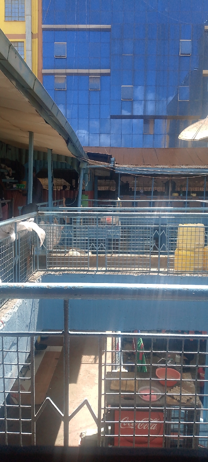 The image depicts an urban market area in Nairobi, Kenya, characterized by a multi-level structure of market stalls juxtaposed against modern high-rise buildings. In the foreground, a set of light blue painted metal railings, showing signs of wear and minor rust, forms a barrier for an elevated platform. Below these railings, a ground-level view reveals a reddish Coca-Cola cooler positioned to the right. To its left, a table or counter holds various objects, including a pink bowl and some unidentifiable white items. The ground surface below is a reddish-brown and appears dusty, with sunlight casting strong shadows. The midground features an active market section. Several individuals are present within stalls, largely obscured by the structure. One person on the left is partially visible, appearing to hold green items. The stalls are constructed with simple frameworks and topped with weathered, rusted corrugated iron roofs. Yellow plastic crates are stacked on the right side of this market level. Overhead, a large, circular, light-colored object, possibly a satellite dish or large lampshade, is partially visible on the far right, above the rusted roofing. The background is dominated by a modern multi-story building featuring a reflective blue glass facade. The facade exhibits multiple rectangular windows, some appearing partially open, and reflects the clear blue sky with scattered white clouds. To the left of this blue building, a section of a yellow multi-story building with standard rectangular windows is visible. The overall environment suggests a bustling commercial zone under bright daylight conditions.