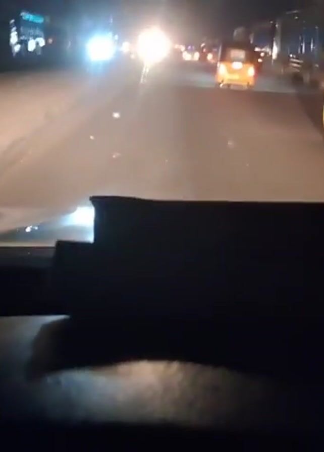 The view from inside a vehicle at night reveals a road scene. The camera is positioned behind the dashboard of the car, capturing the view through the windshield. Headlights of other vehicles illuminate the road ahead, including a brightly lit yellow auto-rickshaw, also known as a tuk-tuk, visible in the right lane. The roadside is blurred, indicating movement. The overall setting suggests urban traffic during nighttime conditions.