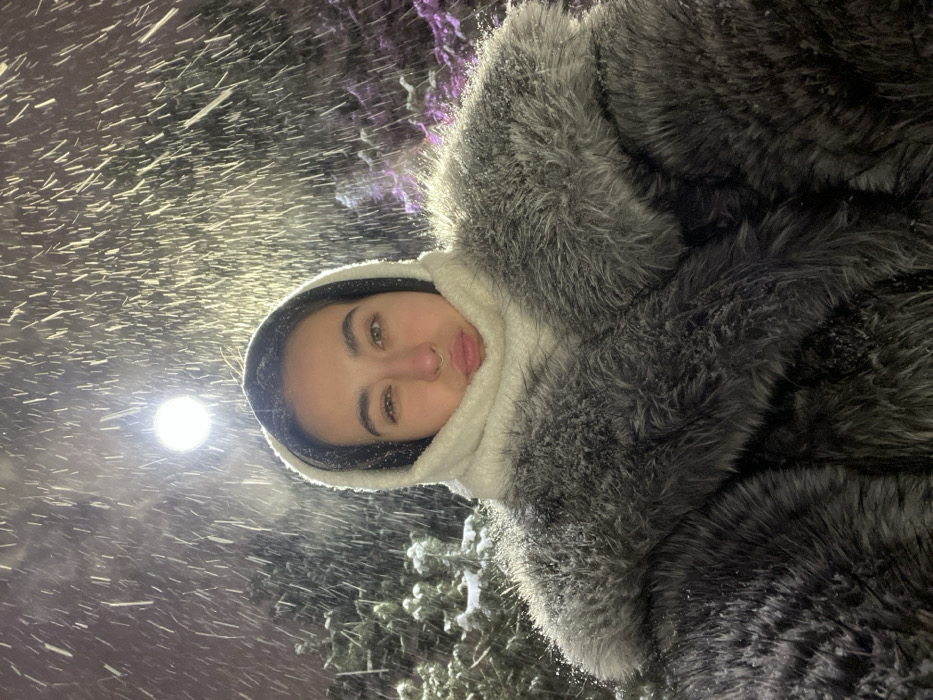 The image presents a close-up, low-angle self-portrait of an individual, likely female, situated outdoors at night in Krasnoyarsk, Russia, during active snowfall