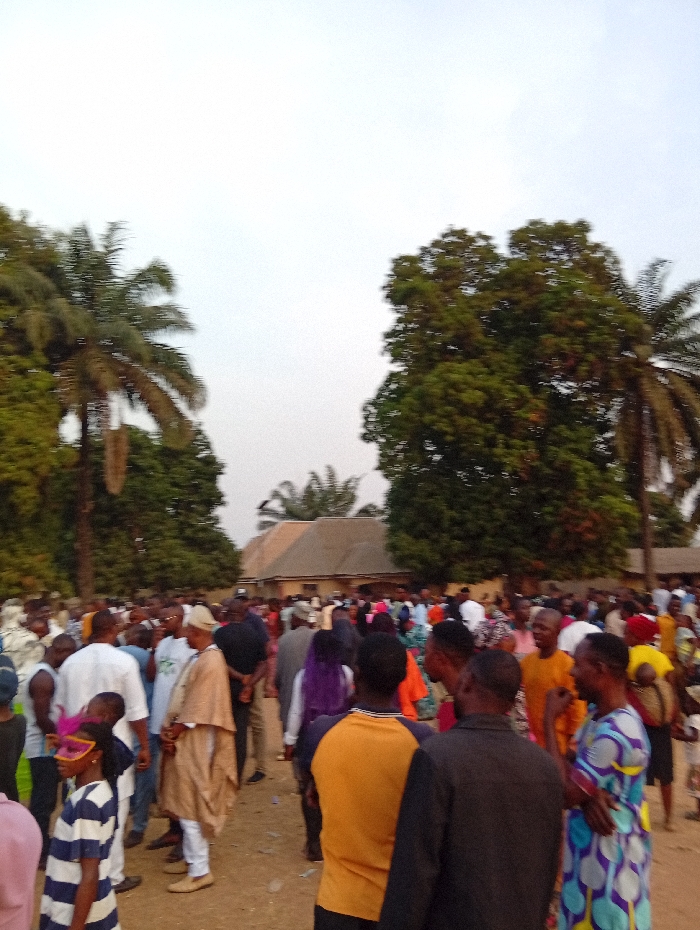 This image depicts a large gathering of individuals in an unpaved, outdoor area within the city of Unknown, Unknown. The scene is dominated by a dense crowd of people, primarily adults, standing on what appears to be a dirt or sandy ground. Various individuals wear a mix of traditional and casual attire, including long robes, patterned dresses, t-shirts, and trousers. One young girl in the foreground wears a blue and white striped shirt and a pink and purple feathered masquerade mask. In the background, a single-story building with a light-colored, possibly corrugated metal, roof is visible, partially obscured by numerous green trees. Tall palm trees are also prominent on both sides of the frame. The sky above is a uniform, overcast light gray or white. The individuals in the crowd appear to be standing, facing various directions, and some are engaged in conversation. No specific actions or interactions beyond standing and proximity are clearly identifiable.