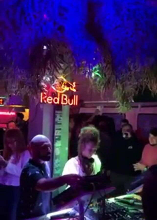 The video captures a lively scene in what appears to be a bar or club setting. The primary focus is on two DJs working at a setup with mixing equipment and turntables. One DJ is a bald man in a dark, patterned shirt, and the other is a woman with curly hair wearing a white shirt. They are both actively engaged with the equipment, presumably mixing music. Around them, a crowd of people is enjoying the atmosphere. Some individuals are dancing, while others are casually standing or talking. The lighting is colorful and vibrant, with blue, green, and pink hues illuminating the space. Above the DJs, there's a neon sign for Red Bull, partially obscured by hanging foliage that is also illuminated by colored lights. The general ambiance suggests a fun, energetic nightlife scene.