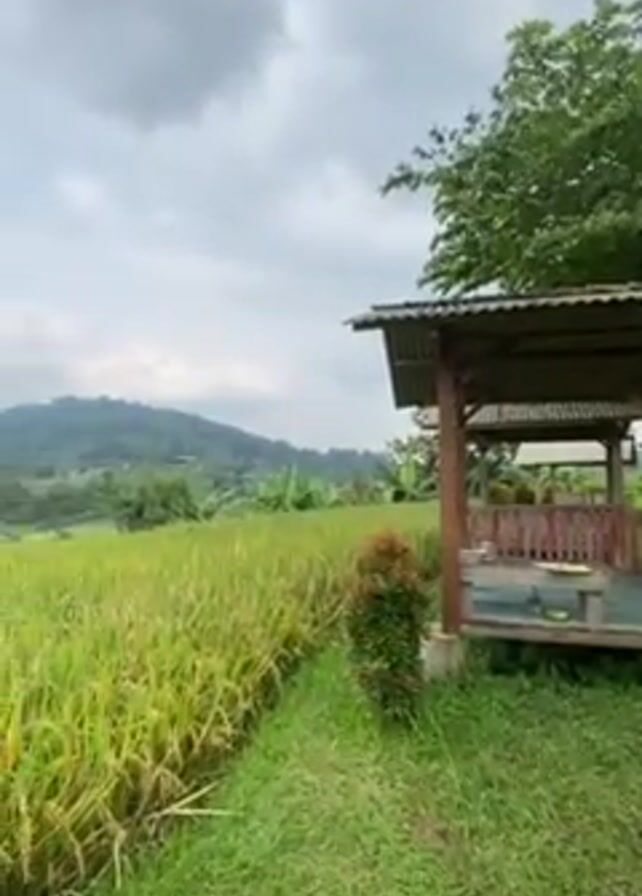 scenic view of a rice field under a cloudy sky. There's a small wooden structure on the right side of the frame. The rice field is golden yellow, indicating the rice is ripening. In the background, there's a mountain partially covered in clouds. A small girl wearing a red and white checkered shirt and a grey hooded jacket walks into the frame from the right and stops near the edge of the rice field, facing towards the mountain.