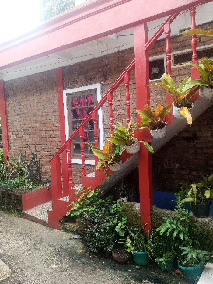 A two-story brick building features an exterior staircase painted bright red. The staircase has decorative balusters and potted plants affixed along the side. A window with red curtains is near the base of the stairs. Various other plants and greenery surround the staircase, adding to the natural aesthetic. The ground is paved and leads to the building's entrance.