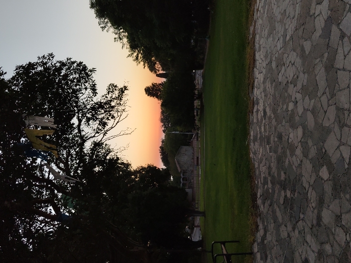 The image depicts an outdoor scene at dusk within the Mate Asher Regional Council, Israel. The foreground consists of a paved area composed of irregularly shaped light and dark grey stones. A dark, metal bench frame is partially visible on the far left. The midground features an expansive, well-maintained green lawn. In the background, beyond the lawn, a stone building with a dark roof and multiple arched openings is visible, situated behind what appears to be a fence or low barrier. A large, dark-leaved tree is prominently silhouetted against the sunset sky in the upper left. Several light-colored garments, appearing to be trousers or similar clothing items, are draped and suspended from its branches. Further back, a dense line of additional trees forms a dark silhouette against the horizon. The sky exhibits a gradient from deep orange and red near the horizon, indicative of sunset, transitioning to a lighter blue-grey overhead. A slender, dark, vertical structure is faintly visible through a gap in the distant trees on the right. No individuals, explicit actions, or interactions are present in the scene.