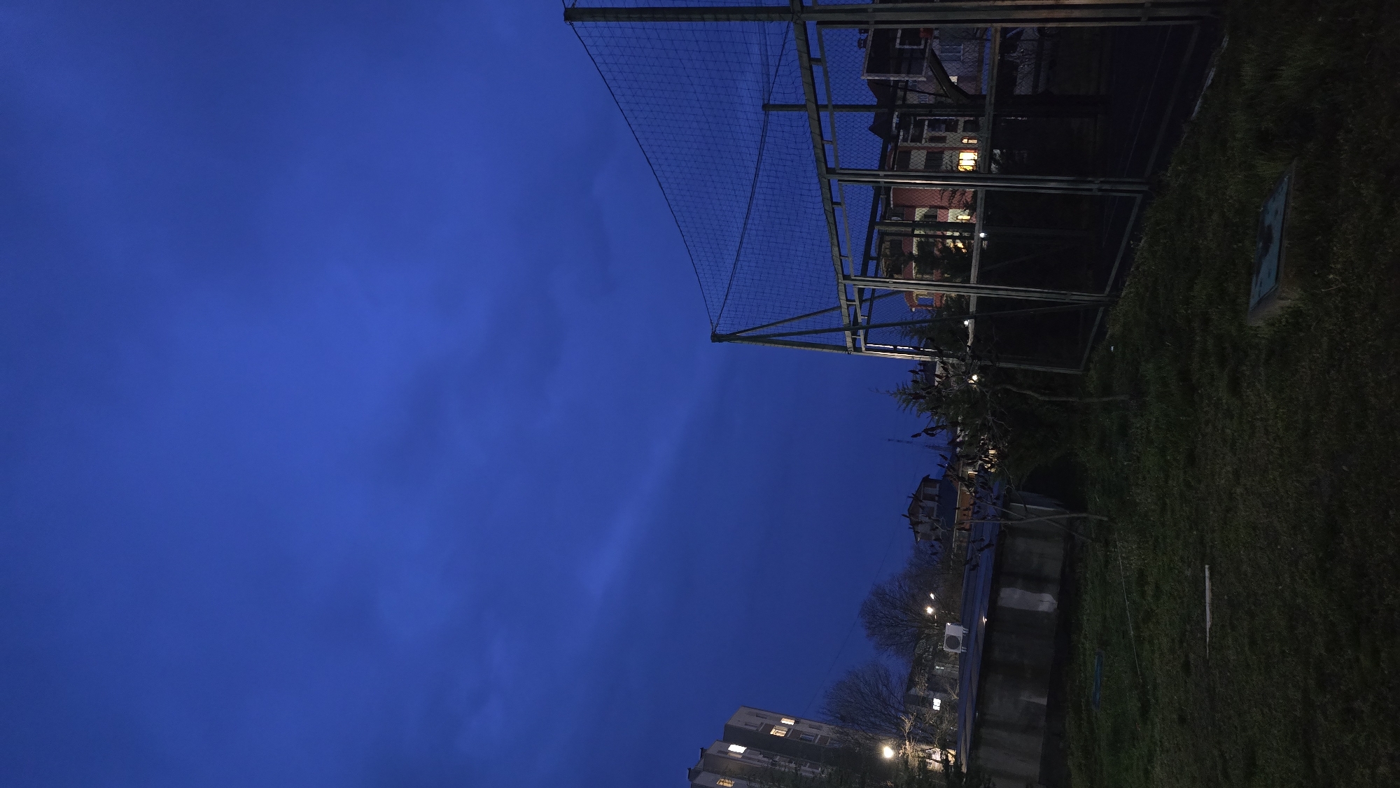 This image depicts an urban residential area in Haskovo, Bulgaria, at twilight or early night. The sky dominates the upper portion, exhibiting a deep, dark blue hue with visible, indistinct cloud formations. The lower half of the frame shows a dark green grassy area in the immediate foreground, containing sparse small trees and a square utility access panel. To the right, a fenced sports court, likely a basketball court, is visible with its metal framework, netting, and a basketball backboard structure. No individuals are present on the court or in the surrounding grassy area. Behind the court fence and in the midground, various multi-story residential buildings are visible, with several windows illuminated by interior lights. A taller apartment building with multiple lit windows is situated on the far left. A low, rectangular building with a corrugated roof and an exterior air conditioning unit is present between the grassy area and the background buildings, to the left of the court. Artificial streetlights emit light from various points in the scene.