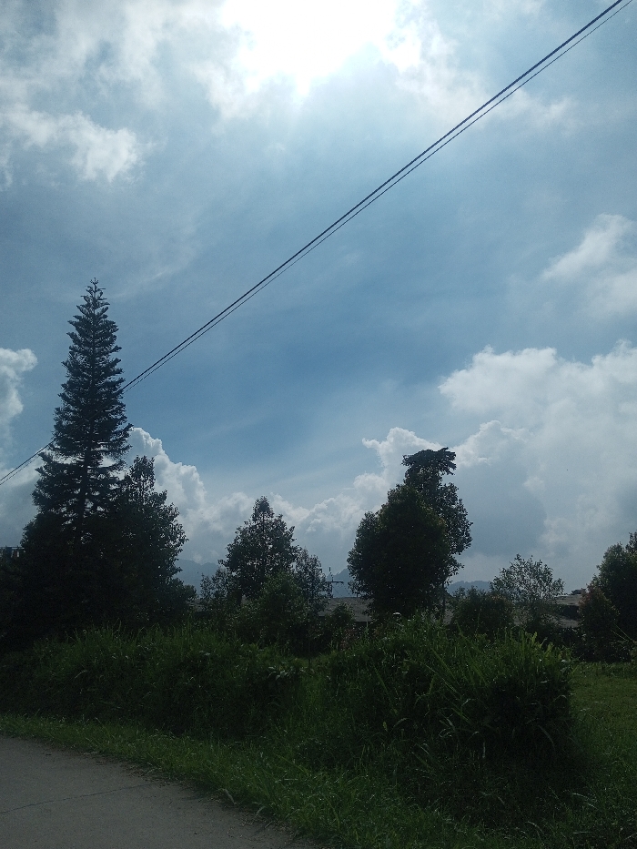 The image displays an outdoor scene in the city of Đăk Pxi, Vietnam, under a bright, partially cloudy sky. The upper portion is dominated by a clear blue sky interspersed with large, white cumulus clouds, with a bright light source, presumably the sun, emanating from the upper right. Two thin, dark utility lines stretch diagonally across the sky from the upper left to the mid-right. The midground features a dense line of various trees and shrubs, casting dark silhouettes. On the far left, a tall, slender, conical evergreen tree stands prominently. Multiple other deciduous and evergreen trees of varying heights form a forested line across the middle of the frame. The foreground consists of overgrown green grass and undergrowth. A dark gray paved surface, consistent with a road or path, is visible along the bottom left edge, bordered by the vegetation. Distant mountains or hills are faintly discernible beneath the clouds and beyond the tree line, with indications of scattered, low-lying structures in the mid-distance. No individuals or active subjects are present.