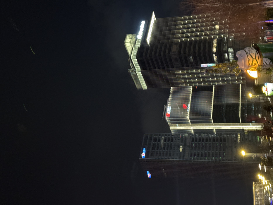 Nighttime cityscape featuring illuminated buildings, oriented vertically